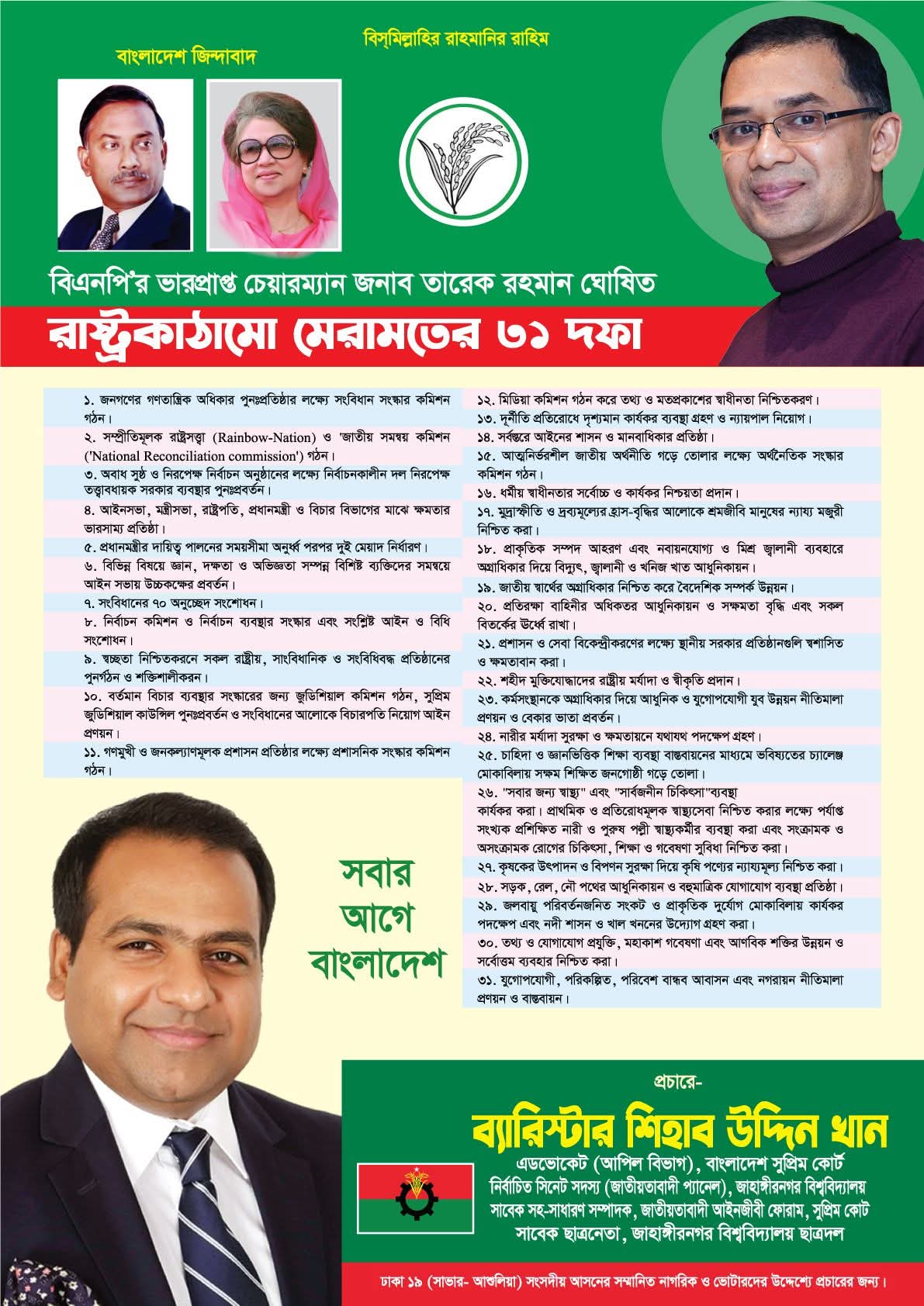 “৩১ দফা কর্মসূচি হলো একটি আধুনিক, গণতান্ত্রিক ও কল্যাণমূলক রাষ্ট্র গঠনের রূপরেখা। এই লক্ষ্যে পৌঁছাতে হলে জনগণের সক্রিয় অংশগ্রহণ অপরিহার্য।”