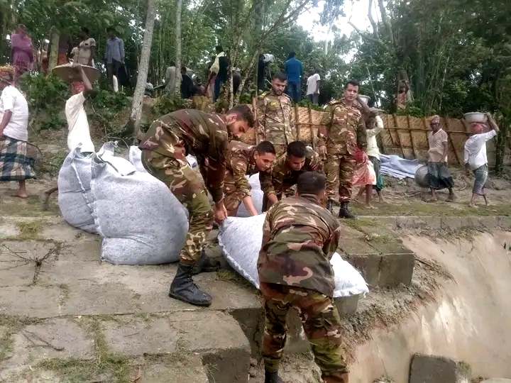 বাংলাদেশ সেনাবাহিনী সিরাজগঞ্জের কাজিপুর থানা সংলগ্ন যমুনা নদীর শহর রক্ষা বাঁধ সংস্কার করেছে। রোববার এ সংস্কার কাজ করা হয়। রাতভর প্রবল বর্ষণ ও স্রোতের কারণে স্থানীয় বাঁধ মারাত্মকভাবে ক্ষতিগ্রস্ত হয় এবং আনুমানিক সকাল ১০০০ ঘটিকায় শহর রক্ষা বাঁধটির ৭০x৩০ বর্গ মিটার এলাকা ভেঙে নদীগর্ভে বিলীন হয়ে যায়। শহর রক্ষা বাঁধ ক্ষতিগ্রস্ত হলে তার প্রভাব পড়বে কাজীপুর এলাকাসহ আশপাশের এলাকায়,এমনকি বেশ কয়েকটি গ্রাম পানিতে ডুবে যাওয়ার আশঙ্কাও রয়েছে। বিষয়টির গুরুত্ব অনুধাবন করে বগুড়া অঞ্চলের সিরাজগঞ্জ জেলায় দায়িত্বরত ১১ পদাতিক ডিভিশনের ৪০ ফিল্ড রেজিমেন্ট আর্টিলারির সেনাসদস্যদের একটি দল পানি উন্নয়ন বোর্ড এবং স্থানীয় জনগণের সহায়তায় বাঁধটি প্রাথমিকভাবে মেরামত পূর্বক ভাংগনের হাত থেকে রক্ষা করে। উল্লেখ্য, যেকোনো দুর্যোগ মোকাবেলায় বাংলাদেশ সেনাবাহিনী সর্বদা জনগণের পাশে আছে এবং থাকবে।